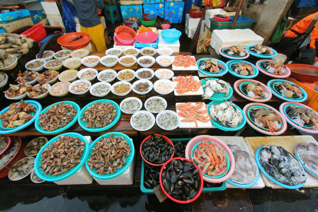 👉 Le poisson cru du marché de Jagalchi, les gâteaux de poisson (eomuk) et les plats de fruits de mer grillés.